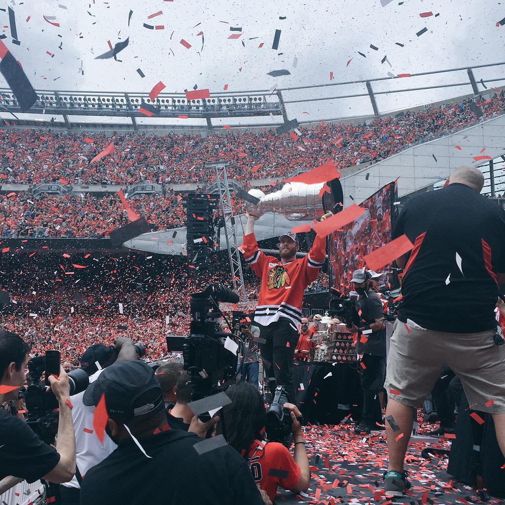 Kris Versteeg pak dal vzpomenout na své rapové vystoupení z léta roku 2010 a společně s Joakimem Nordströmem na závěr zazpívali. S reproduktorů se pak ozvala hudba, do vzduchu vystřelily konfety a hráči si jeden po druhém předávali stříbrný pohár tak jako před několika dny po rozhodujícím šestém utkání na ledě United Center. Malému Reifovi pomohli Kane se Shawem a s pohárem se radovali také ostatní členové klubu.